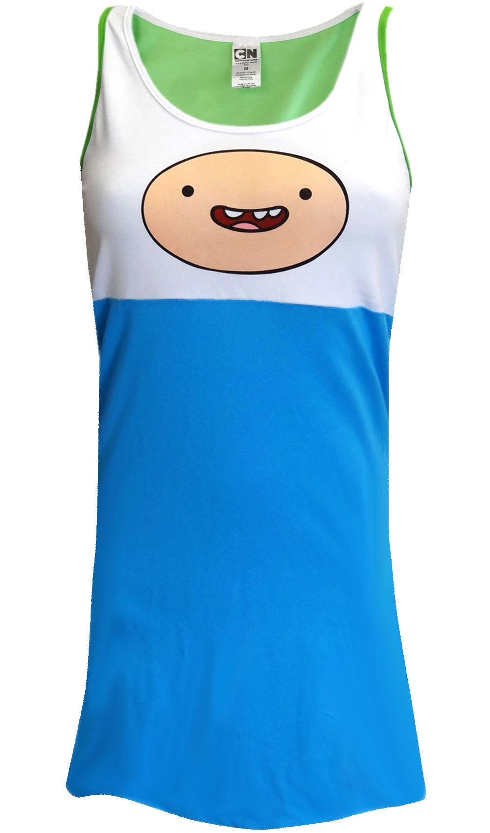 Are you ready for adventure in the Land of Ooo? With his trusty magical dog Jake, Finn the Human is going to save the day! This nightgown showcases a huge Finn face on the center on a white background. Below the empire waist the nightgown is sky blue. The back of the gown is a two tone green with summary, designed to look like his backpack. A hint of spandex adds comfortable stretch. Junior cut.