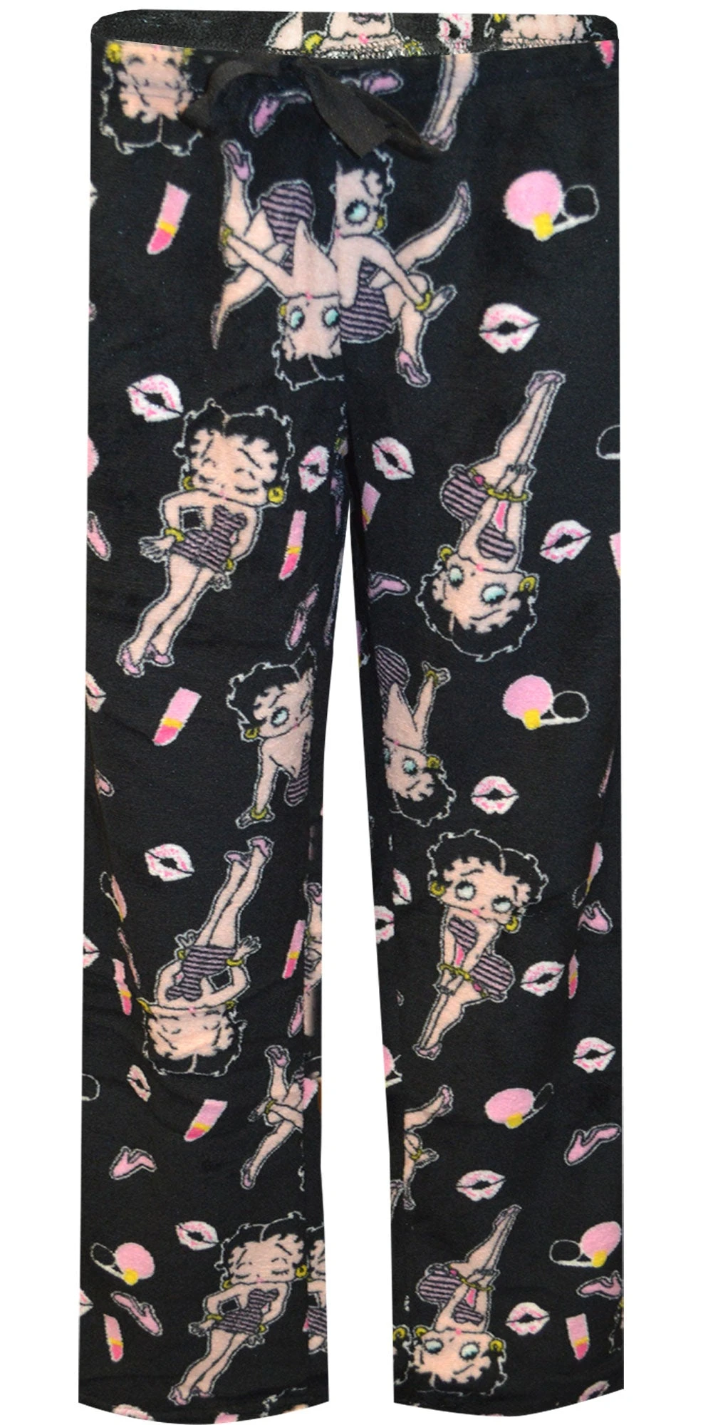 So soft and warm! These lounge pants for women are so soft you will want to wear them all day! They feature Betty Boop on a black plush fabric. They have an elastic waistband with a pretty tape tie bow. Machine washable and easy to care for.