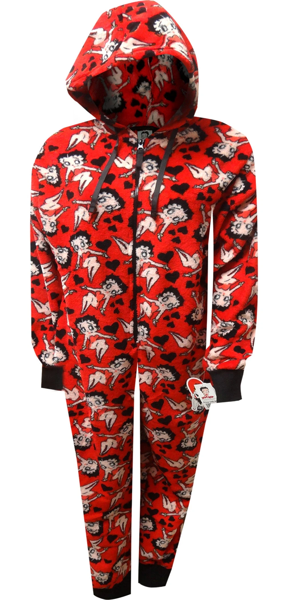 So cozy! These plush pajama sets for plus size women are traditional one piece pajama styling. The best part is that they have a really fun pattern of Betty Boop on them! These red one piece zipper-closure pajamas have a hood and ribbed cuffs at the wrists and ankles. The plush fabric on these is thick and soft. Machine wash.