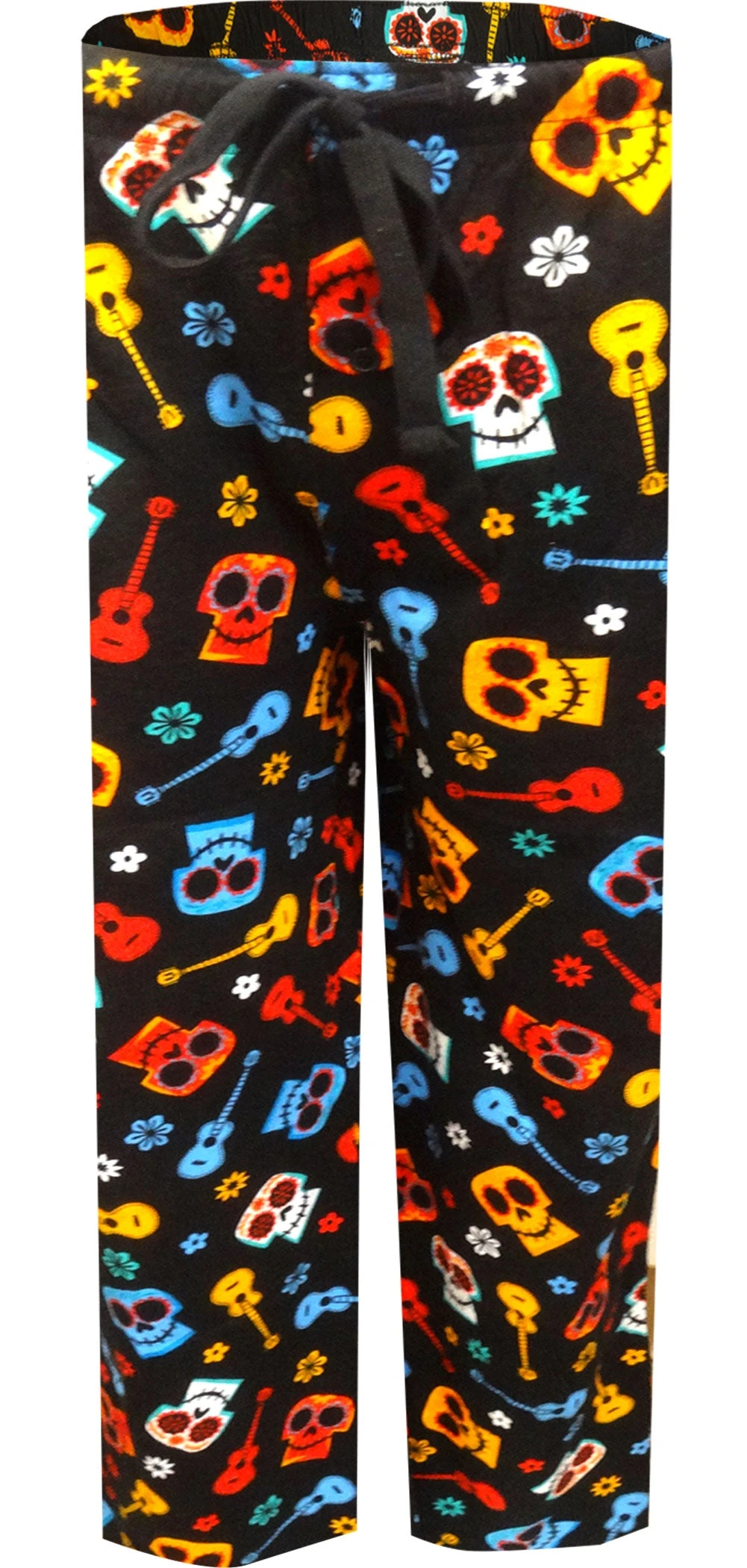 Fans of the Disney Pixar Coco Movie can appreciate the awesomeness of these lounge pants. Made of 100% cotton, the design is an all over print from the land of the dead where Miguel’s musical adventure takes place. These pajama pants have a covered elastic waistband with a drawstring tie, a summary fly and two pockets.
