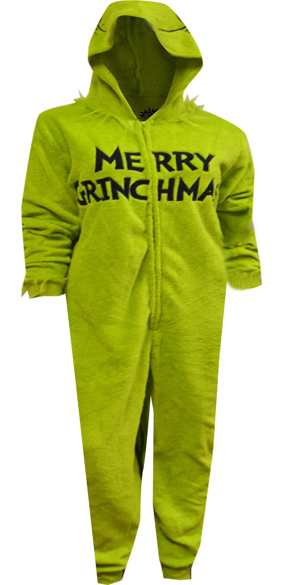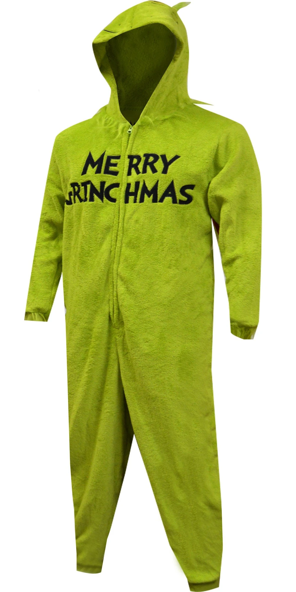 Looks like he has a wonderful, awful idea brewing! These one piece pajamas feature the scheming Grinch Who Stole Christmas on a plush green fabric, wishing you Merry Grinchmas! These jammies have ribbed cuffs at the wrist and ankles and a hood complete with a Grinchy face and a tuft of Grinch hair.