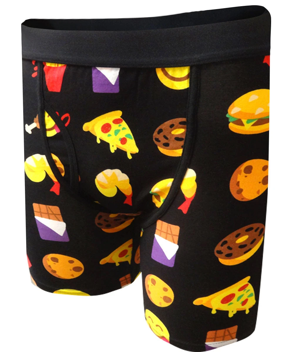With a snack for whatever craving you have at the moment, these boxer briefs for guys feature the emoji version of just about every snack food out there. Boxer briefs have a functional fly and an exposed wasitband.