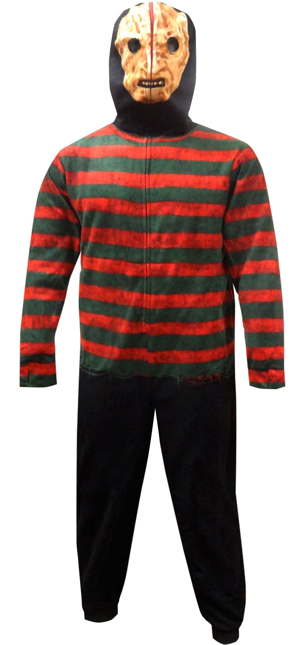 This is absolutely frightening! The one piece pajamas are designed to look just like Freddy Krueger from the Nightmare on Elm Street horror movie, complete with hood that zips completely closed over the face with mesh eyes. There is even a drop seat and two pockets! Sizing as follows: Medium fits 5’3″-5’7″ 125-150 lbs. Large fits 5’7″-5’11” 150-175 lbs. XL fits 5’11”-6’2″ 175-225 lbs.