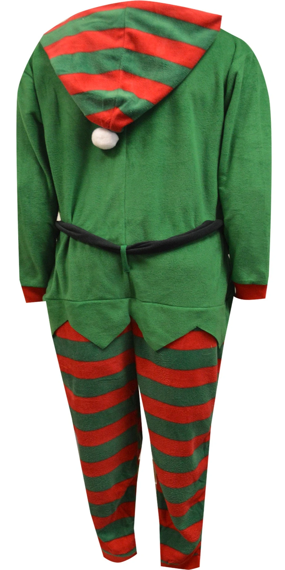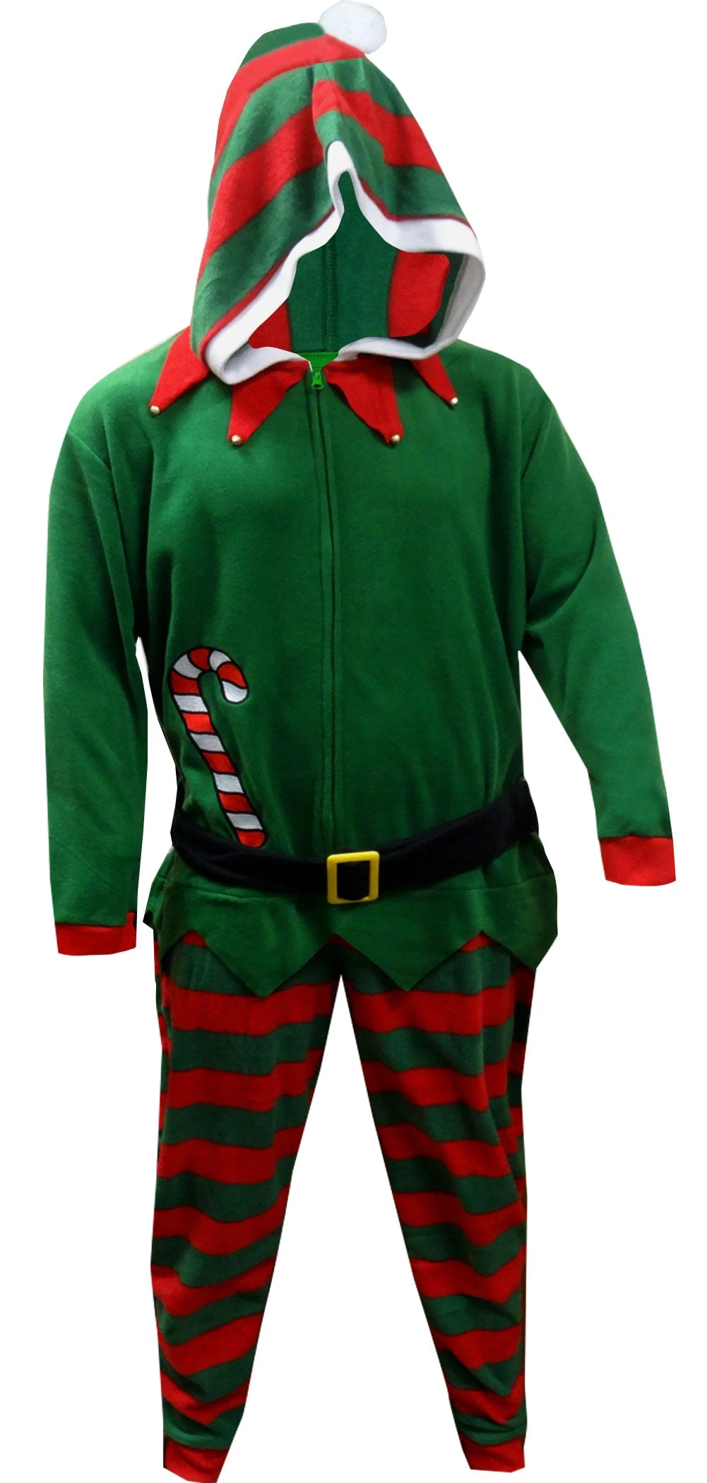 Be the best dressed Santa’s Little Helper at the party! These hooded one piece pajamas for men are designed to look just like one of Santa’s elves, complete with real jingle bells on the collar and a real belt. The belt is adjustable and removable for washing. These soft micro polar fleece one piece pajamas have ribbed cuffs at the wrist. Due to the nature of the decoration, please HAND WASH. No feet.