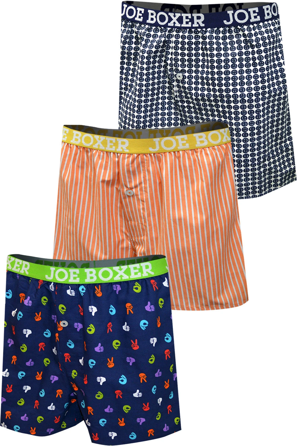 This Joe Boxer multi pack is a wardrobe must have! This 3 pack of traditional woven cotton boxer shorts for men includes 3 pairs (estate blue geo, persimmon orange stripe, estate blue hands). These boxers have the signature Joe Boxer waistband. They have a summary fly, are an easy comfort fit with an airflow design and are tag free.