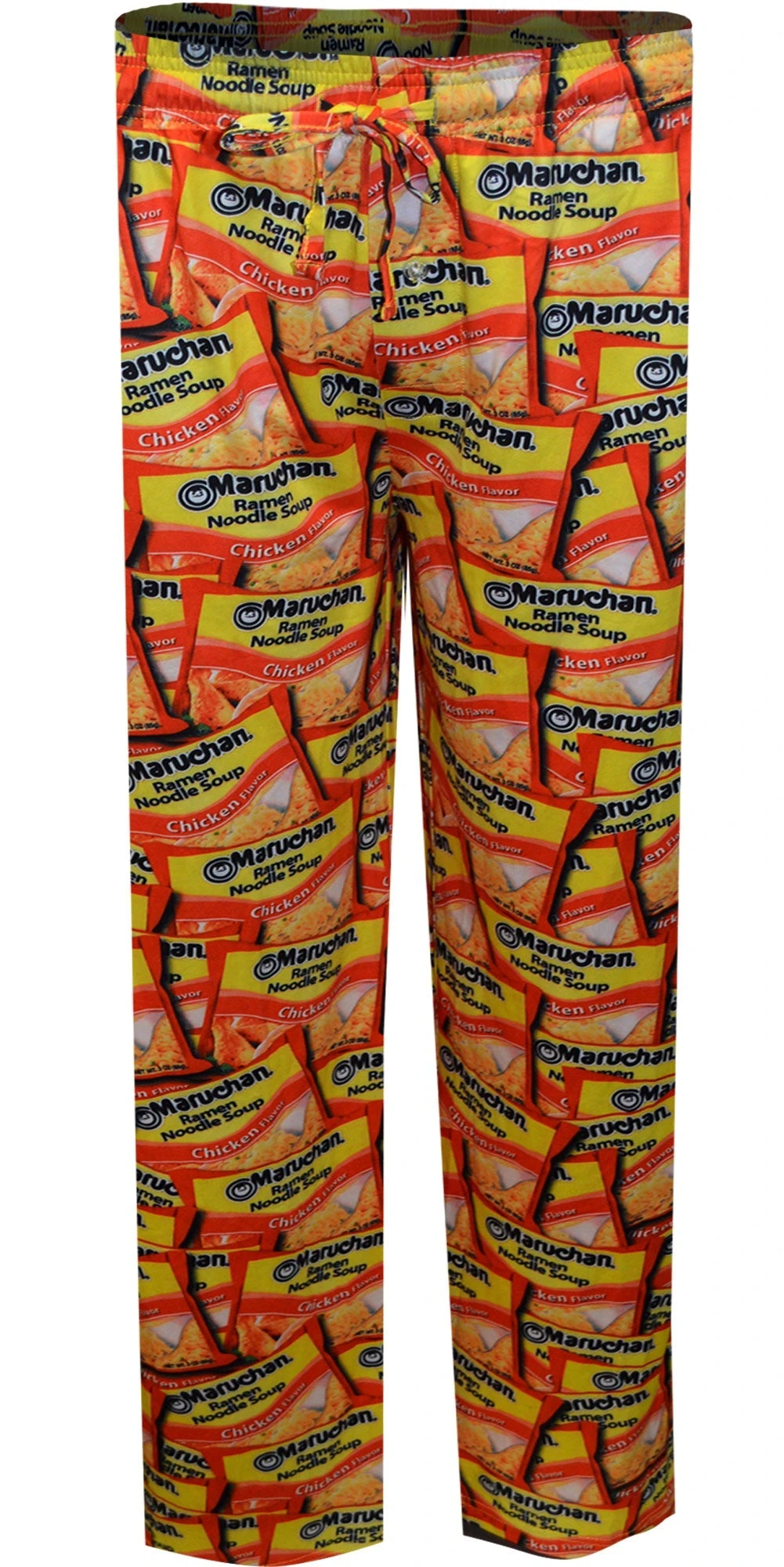 Perfect for all ramen noodle lovers! This lounge pant is made from a super soft performance fabric. These pajama pants feature the Maruchan classic packaging in an all over pattern. Lounge pants have a drawstring and elastic waist, summary fly and two pockets. Machine wash, easy care.