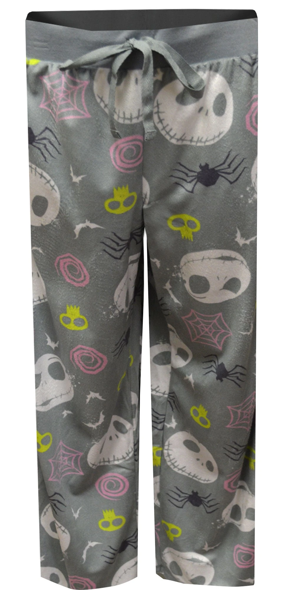 Creepy fun! These super soft silky fleece loungepants for women feature Jack Skellington from Disney’s The Nightmare Before Christmas film. These gray pajama pants have a wide elastic waistband and drawstring tie.