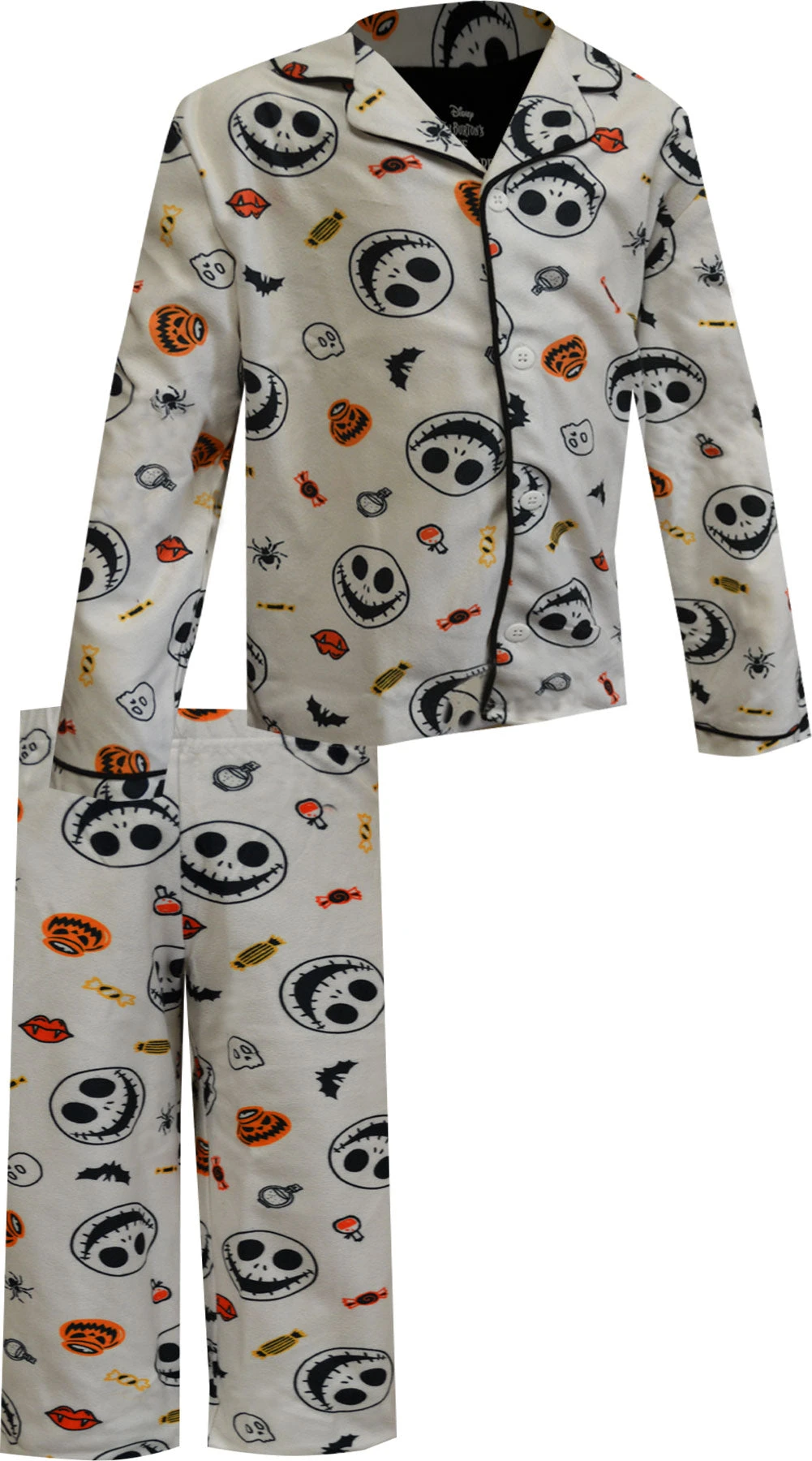 Perfect for relaxing on the couch and watching the Nightmare Before Christmas movie! These awesome flannel pajamas for children feature the King of Halloweentown, Jack Skellington, with Halloween symbols and candy. Made from flame retardent fabric to comply with safety regulations, these jammies have traditional summary front styling. Perfect from Halloween through Christmas and more!