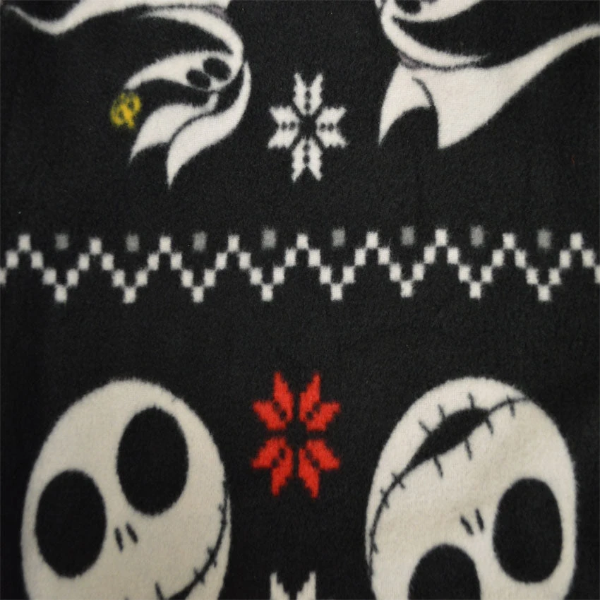 Creepy fun! These super soft and warm fleece lounge pants for men feature Jack Skellington from Disney’s The Nightmare Before Christmas film. These pajama pants are machine washable with an open fly and covered elastic waistband with drawstring tie and two pockets.