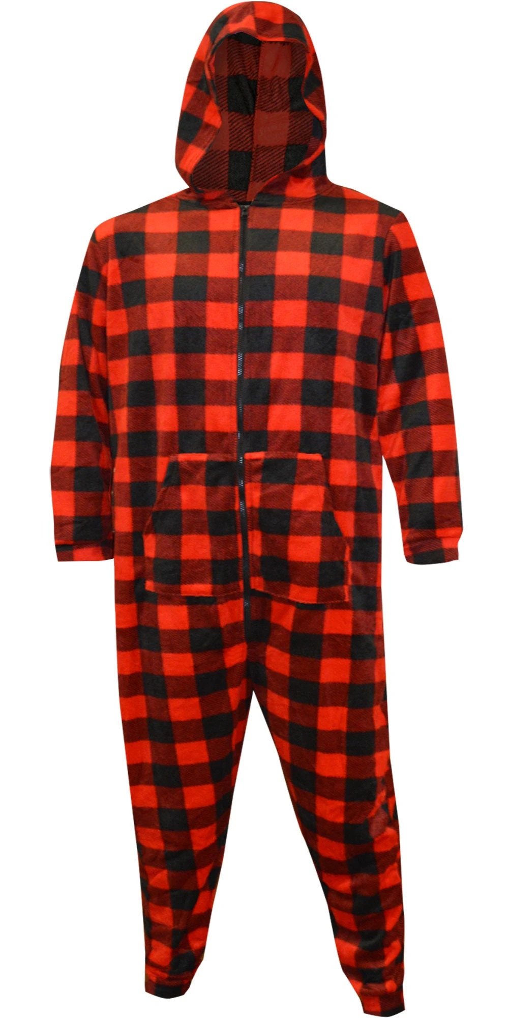 Super Cozy! These ultra soft fleece onesies for men feature a bold buffalo plaid print in red and black. This one piece pajama has a hood and two pockets. These union suits are machine washable and easy care. Perfect for that cold weather.